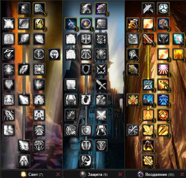 В ротации не забывайте клацать «Священный щит». Используйте постоянно по КД «Длань свободы» — это даст вам свободу передвижения, так же данная способность снимает стамы и различные оглушения. Не забываем использовать «Очищение» — снимает яды и не хорошие магические воздействия на вас со стороны противника.